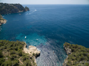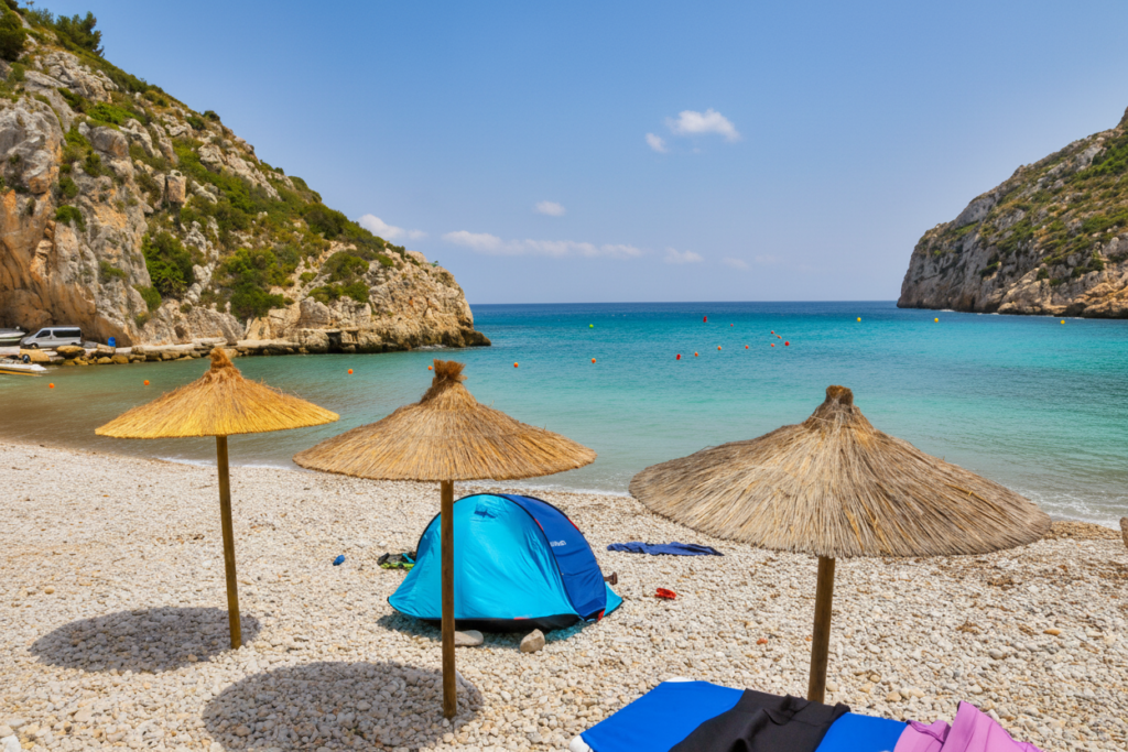 Der Weg zur Bucht führt durch dichte Wälder aus grünen Aleppo-Kiefern, die bis fast ans Wasser reichen. Die Bucht selbst ist ein Kieselstrand mit glatten, weißen Steinen. Das Besondere: Das Wasser ist hier so ruhig und kristallklar wie kaum anderswo. Schon wenige Meter nach dem Einstieg wechselt der Untergrund zu feinem Sand. Das macht die Granadella zu einem natürlichen Pool mit leuchtend türkisfarbenem Wasser – ideal zum Schnorcheln und Tauchen.