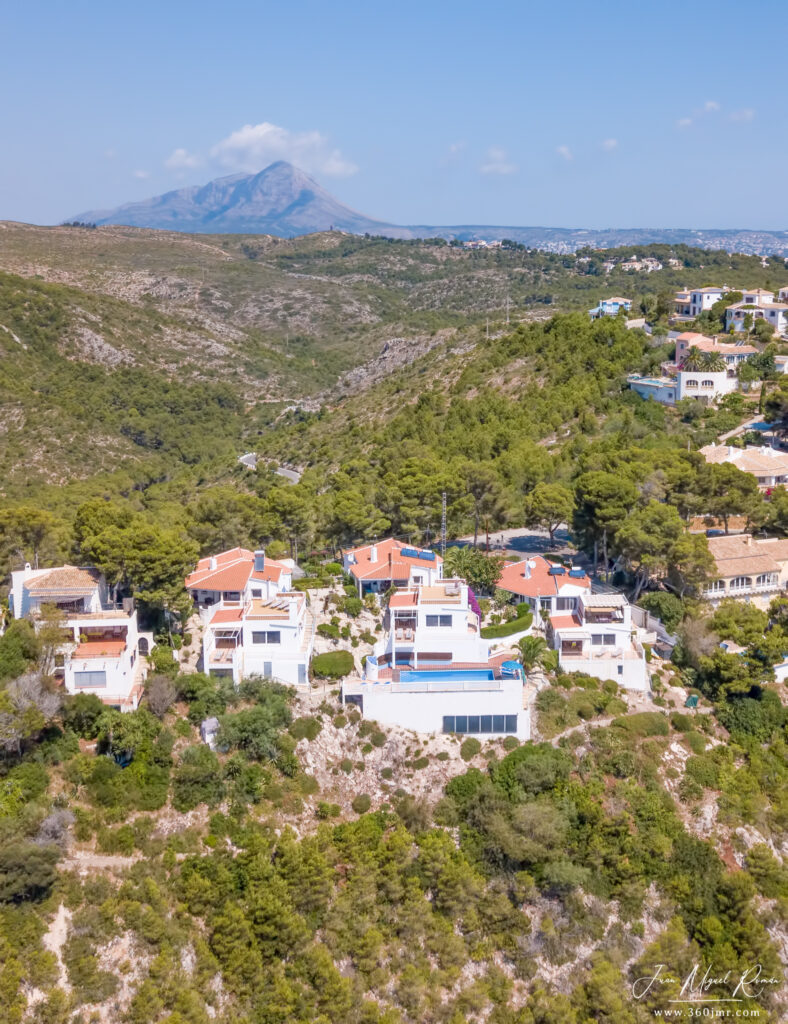 Rückwärtig sieht man eines der Wahrzeichen Javeas, den Mont Go, von dessen Bergspitze man bei gutem Wetter eine Fernsicht bis nach Ibiza hat.